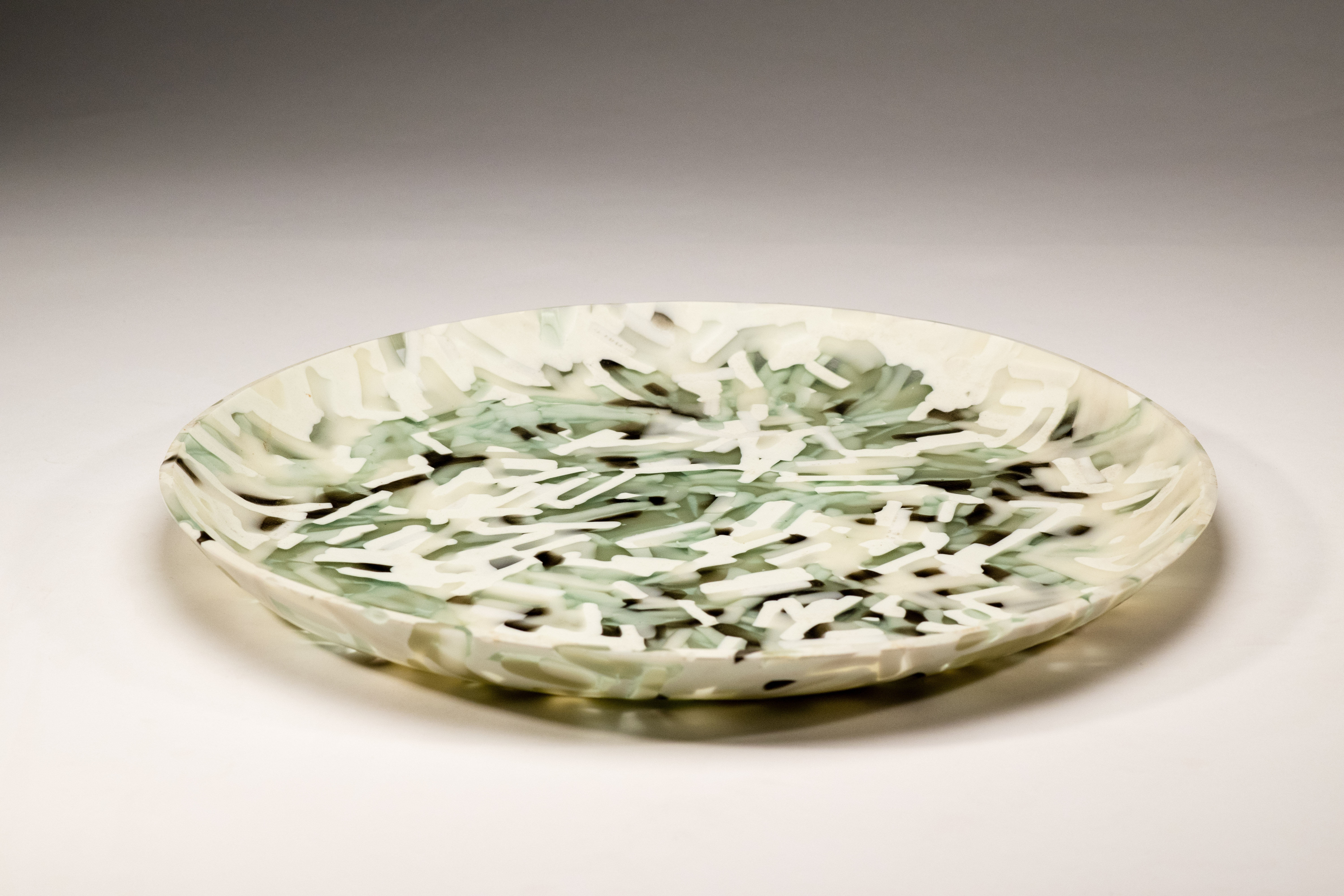 The OnGrade imprint is also playful, allowing Sandberg to experiment with form, method, and in many cases, color. In particular, a recent series of pastel plates were created from pulled glass cane, a process that Sandberg has taught for years but has only recently utilized in his art practice. The canes, in contrast to the reserved palette he is known for, are a vibrant mix of blues and greens.