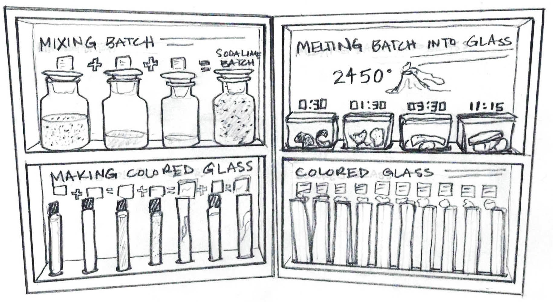 We developed a hands-on interactive kit designed to be used by educators, gallery guides, and parents, to augment and facilitate a materials discussion about glass. The kit includes a field guide with drawings and infographics to foster deeper conversations about the science behind making glass.
