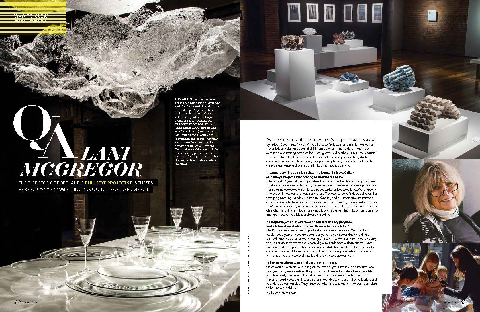 As the experimental “skunkworks” wing of a factory started by artists 42 years ago, Portland’s new Bullseye Projects is on a mission to spotlight the artistic and design potential of kilnformed glass and to do it in the most accessible and inviting way possible. Through themed exhibitions in its 9,000-squarefoot Pearl District gallery, artist residencies that encourage innovation, studio commissions, and hands-on family programming, Bullseye Projects redefines the gallery experience and pushes the limits on what glass can do.