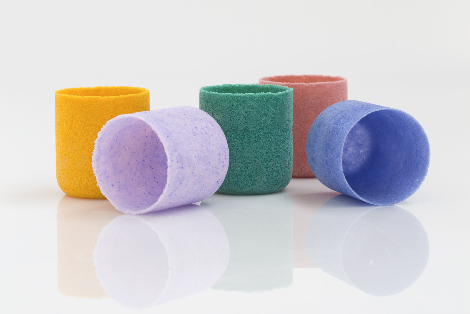 They are shown alongside Joshua Kerley's innovatiove pendant lighting made of pâte de verre – small grains of glass in paste pressed into a mould fired in a kiln. Kerley's playful use of colour, with soft yellows, pinks, and a dash of cobalt, is also evident in his series of jars with glass foam lids. He upends contentional perceptions of glass, combining and juxtaposing traditional techniques with mundane materials like cork or common brick.