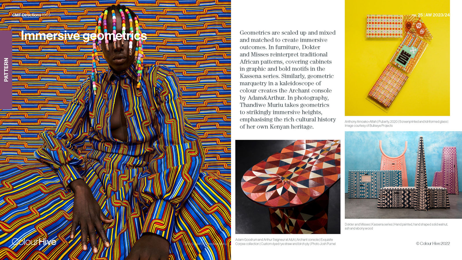 Anthony Amoako-Attah manipulates glass to look like woven fabric by screen printing and kiln-forming with glass powders. His work explores themes related to migration, dislocation and personal identity using traditional Kente designs and Adinkra symbols from Ghana.